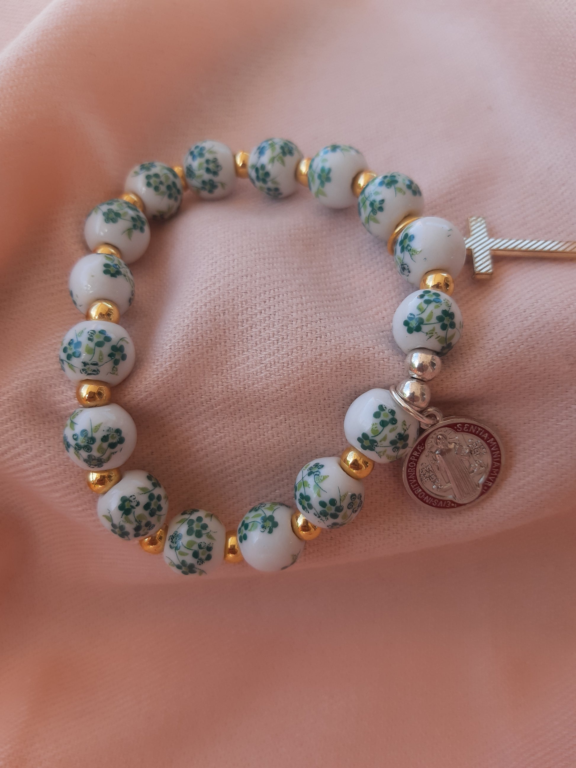 Bracelet Rosary ceramic type with gold and pearl type WHITE dark FLORAL
